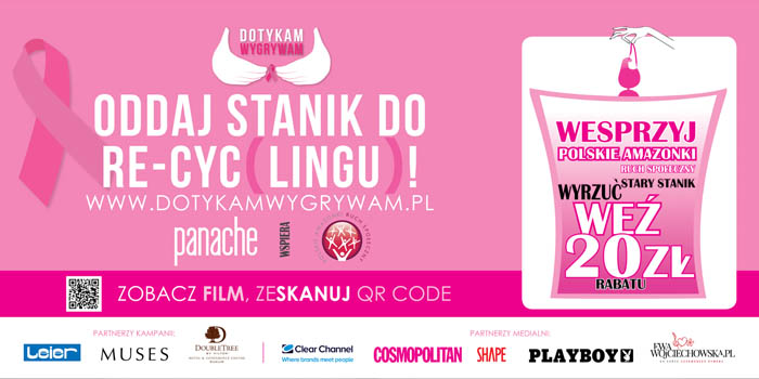 Data publikacji: 2014-10-15 Dodaj do ulubionychTrwa akcja re-CYC(ling) w ramach III edycji kampanii DOTYKAM=WYGRYWAM, której organizatorem jest bieliźniana marka Panache. W niemal 100 salonach w całej Polsce (adresy na www.dotykamwygrywam.pl) znajduje się KOSZ NA BIUSTONOSZ. Każda Pani, która wyrzuci do niego swój stary, zużyty i źle dopasowany biustonosz otrzyma bon o wartości 20 zł na zakup nowego i idealnie dopasowanego biustonosza z oferty marek Panache. Wszystkie zebrane biustonosze zostaną sprzedane firmie budowlanej Leier, która wykorzysta je, jako alternatywne źródło energii w procesie produkcji. Całkowity zysk z recyklingu zostanie przekazany na rzecz stowarzyszenia Polskie Amazonki Ruch Społeczny, które wspiera walkę z rakiem piersi!