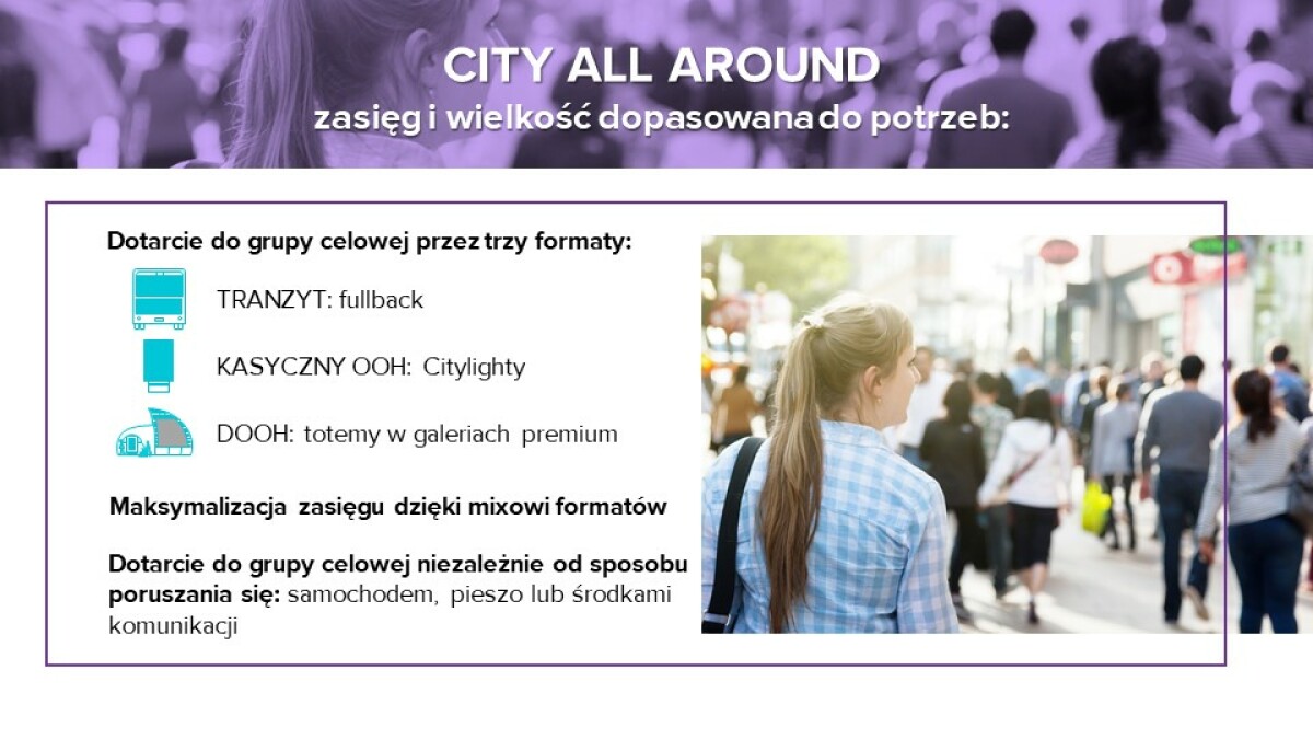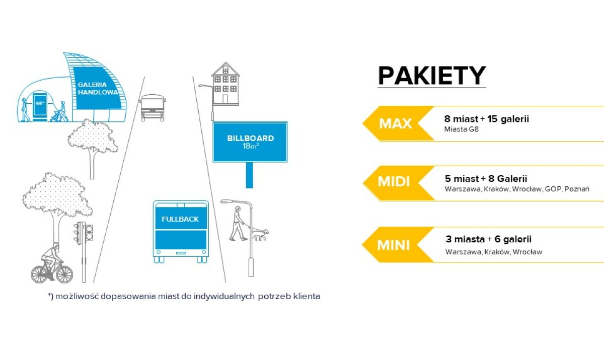 Jak pokazują badania, najskuteczniejsze kampanie to kampanie łączące w sobie mix kanałów dotarcia, tzw. 360 stopni. Posiadając w ofercie bazę różnorodnych nośników, przygotowaliśmy dla Was dedykowane pakiety skierowane do różnych grup odbiorców z wykorzystaniem nośników: klasycznych, digitalowych i tranzytowych.