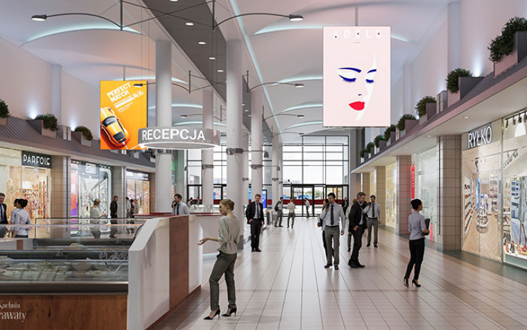 Nowoczesna powierzchnia reklamowa daje gwarancję najwyższej jakości i unikalnej ekspozycji prezentowanych materiałów. Podwieszane ekrany o wymiarach 2 na 3 metry zapewniają wyjątkowo dobrą widoczność, także z daleka.